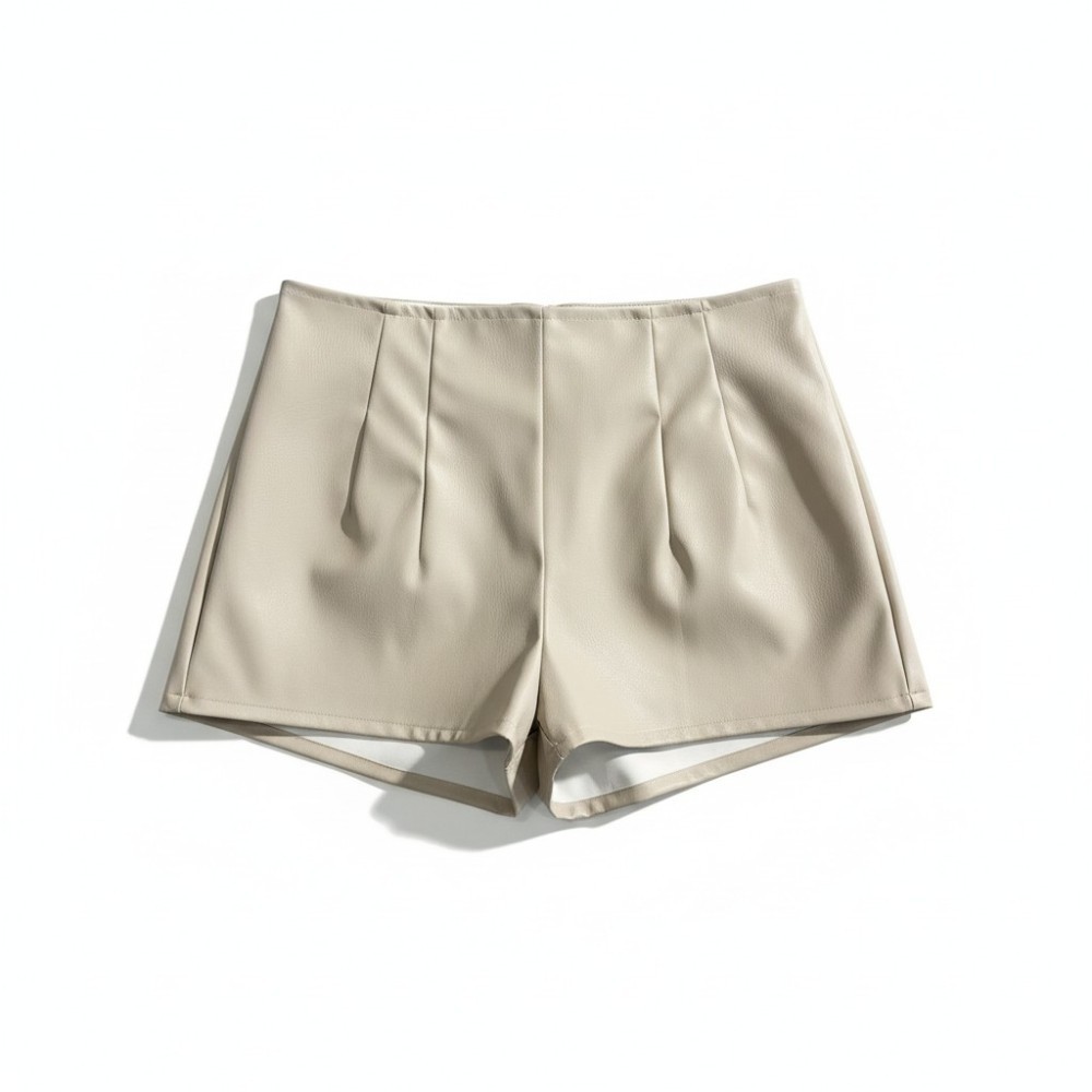 Κομψό γυναικείο σορτσάκι σε δερματίνη που συνδυάζει μοντέρνο στυλ και άνεση. Η minimal σχεδίαση με τις διακριτικές πιέτες μπροστά χαρίζει elegant χαρακτήρα και κολακεύει τη σιλουέτα.