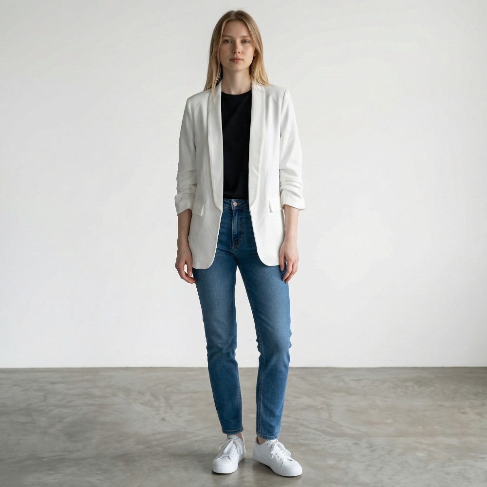 Κομψό γυναικείο blazer με minimal σχεδιασμό που προσφέρει διαχρονικό στυλ και ευελιξία σε κάθε εμφάνιση. Η καθαρή γραμμή και το ανοιχτό μπροστινό μέρος δημιουργούν ένα κομψό και μοντέρνο αποτέλεσμα, ιδανικό για καθημερινά αλλά και πιο formal outfits. Τα γυρισμένα μανίκια δίνουν μια μοντέρνα και relaxed πινελιά.