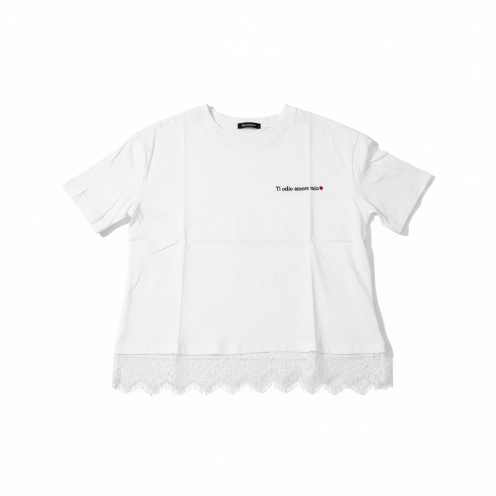 Μοντέρνο γυναικείο t-shirt που συνδυάζει casual στυλ με θηλυκές λεπτομέρειες. Διαθέτει μικρό διακριτικό print στο στήθος και εντυπωσιακή δαντέλα στο τελείωμα, που προσθέτει ρομαντικό και κομψό χαρακτήρα στο σχέδιο. Η άνετη γραμμή και το μαλακό ύφασμα το κάνουν ιδανικό για καθημερινές εμφανίσεις.