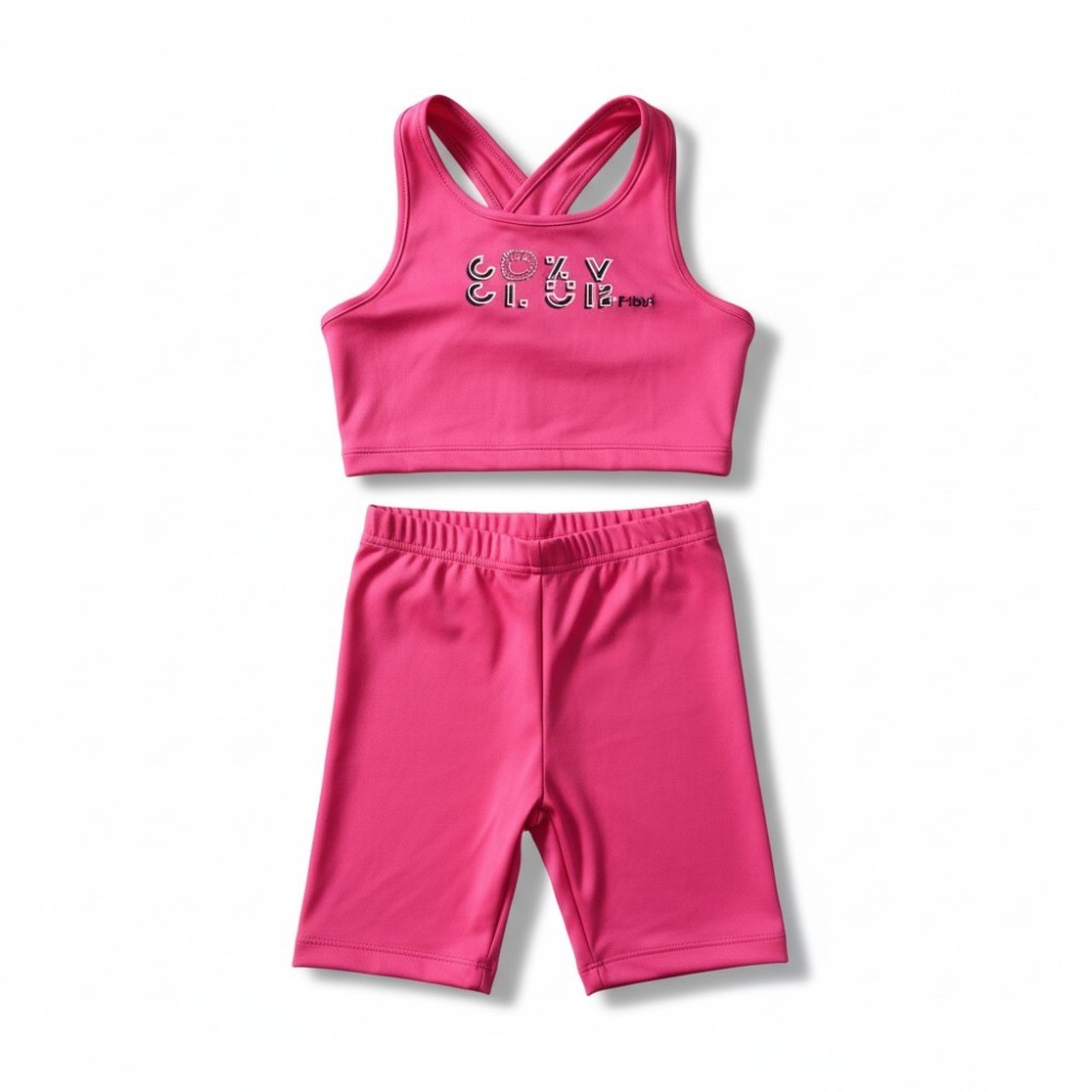 Μοντέρνο παιδικό αθλητικό σετ σε εντυπωσιακό φούξια χρώμα που αποτελείται από crop top και κολάν σορτσάκι. Το τοπ διαθέτει αθλητική πλάτη (cross back) και μοντέρνο τύπωμα στο μπροστινό μέρος, χαρίζοντας δυναμικό και sporty στυλ.