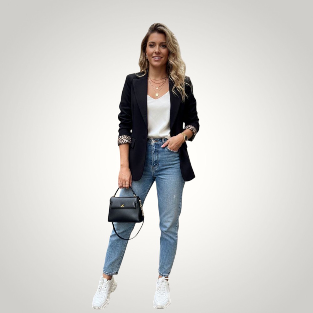 Κομψό γυναικείο blazer Libra Collection σε διαχρονικό μαύρο χρώμα με μοντέρνα γραμμή που αναδεικνύει τη σιλουέτα. Οι ιδιαίτερες leopard λεπτομέρειες στο εσωτερικό των μανικιών δίνουν ένα fashionable twist στο κλασικό σακάκι.
