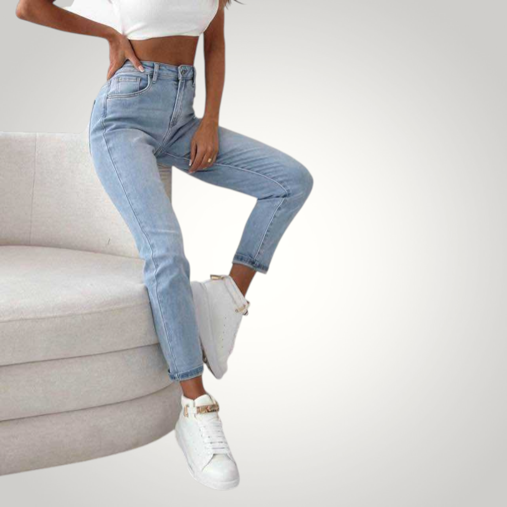 Μοντέρνο γυναικείο jean mom fit Libra Collection σε ανοιχτό μπλε χρώμα με ψηλόμεση εφαρμογή που αγκαλιάζει τη μέση και προσφέρει άνεση στην καθημερινότητα.