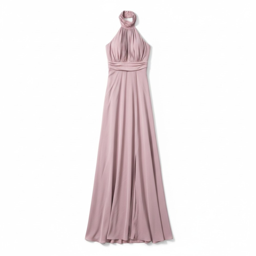 Η halter λαιμόκοψη, που δένει πίσω από τον λαιμό, αφήνει τους ώμους και την πλάτη διακριτικά ακάλυπτους, προσφέροντας μια ιδιαίτερα θηλυκή αισθητική. Το ντραπέ μπούστο αγκαλιάζει το σώμα, ενώ η τονισμένη μέση με διακριτική ζώνη κολακεύει τη σιλουέτα.